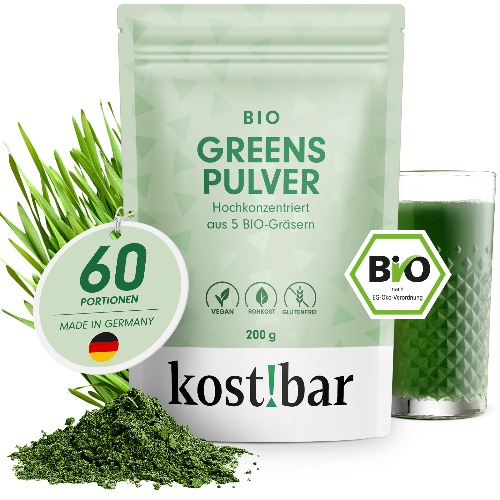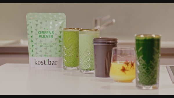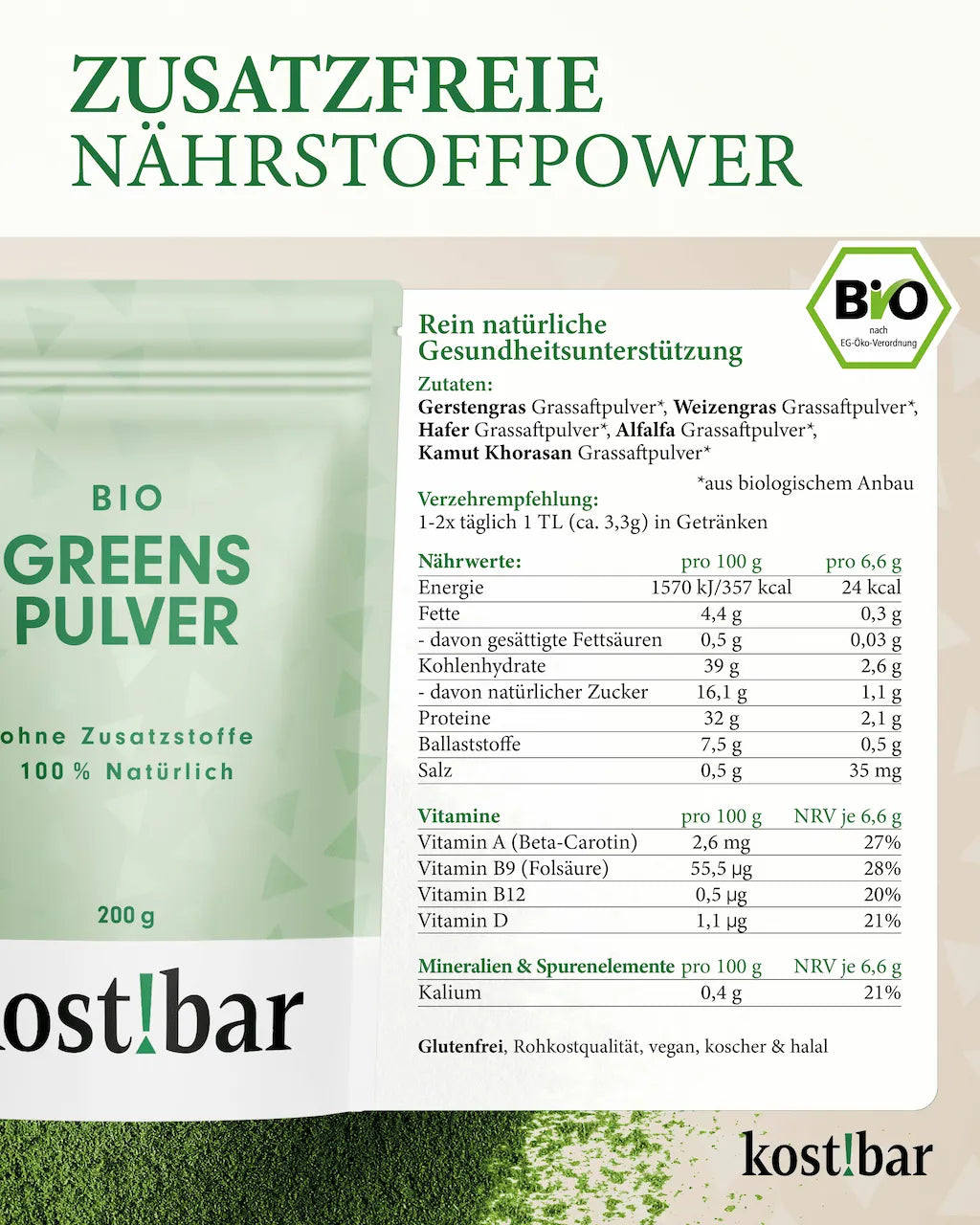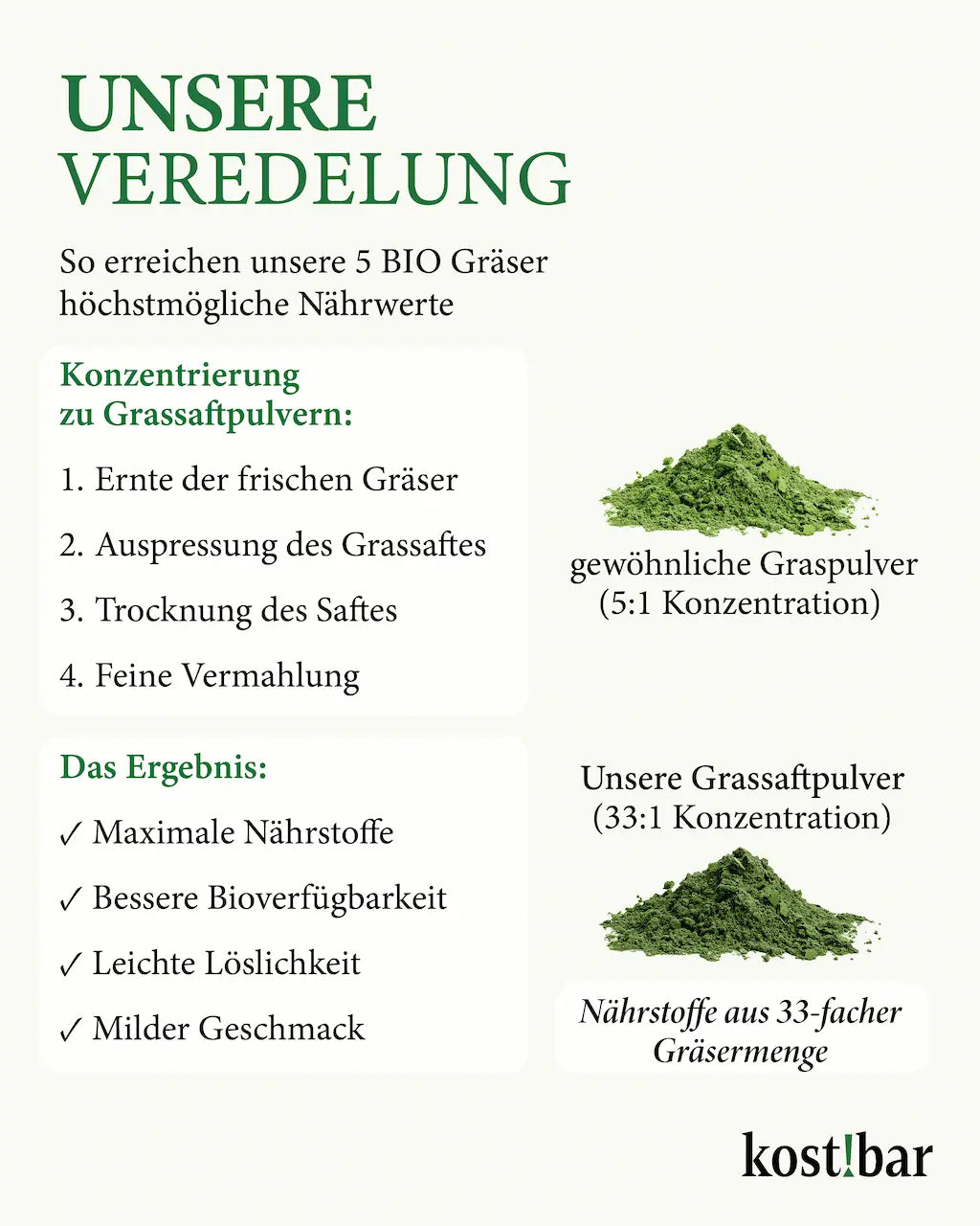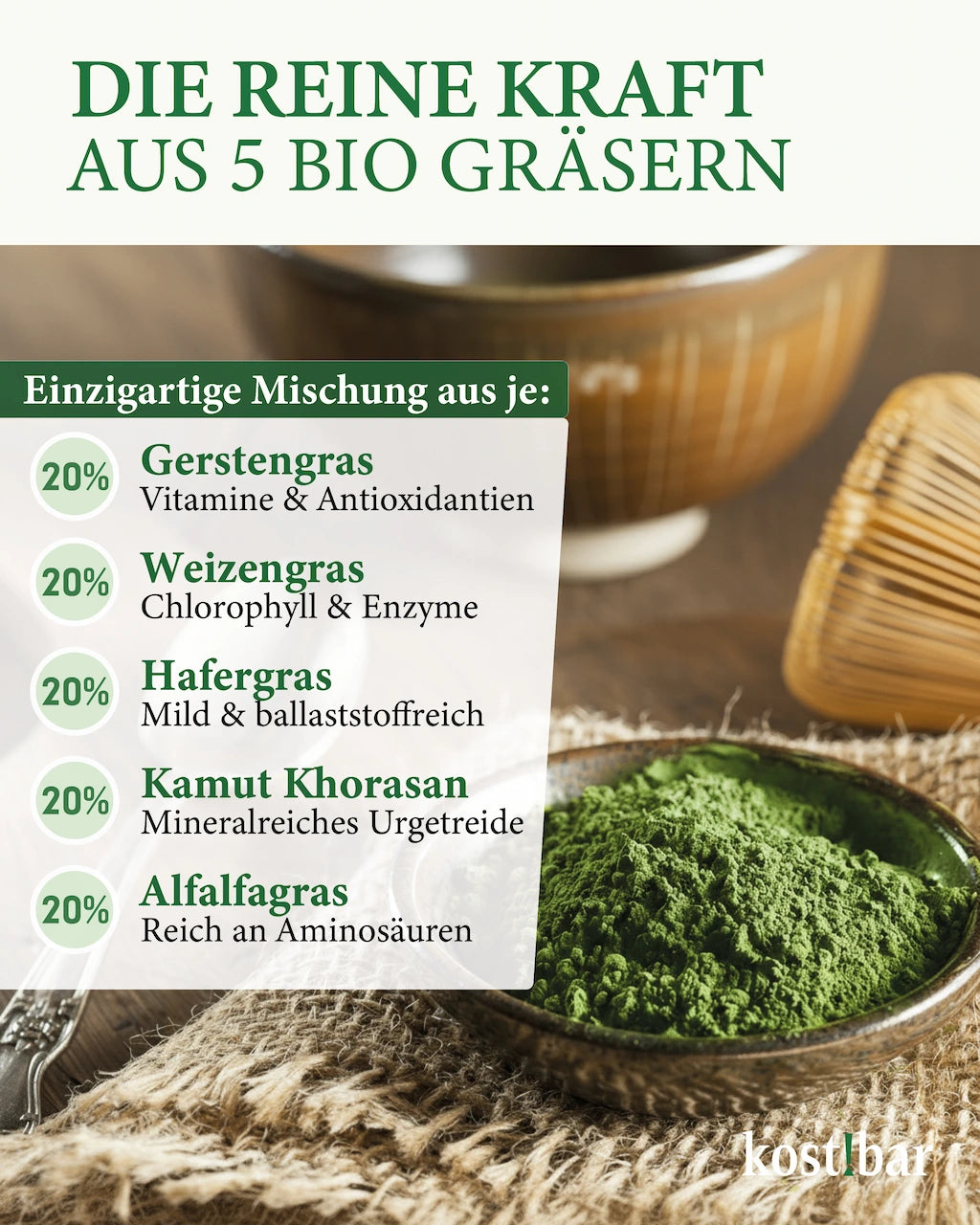 Enthält zu jeweils 20% BIO Grassaftpulver aus Gersengras, Weizengras, Hafergras, Kamut Khorasan & Alfalfa.